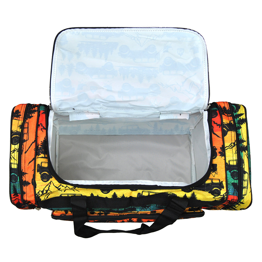 Made from canvas material. Duffel bag measures approx.: 23" x 10.5" x 12.5". Perfect size to take to a camping trip, gym, road trip, dance class, beach, etc.
