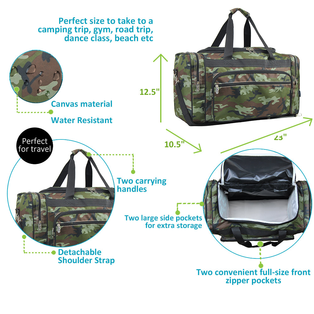 The duffle bag is made from canvas material that is durable and could withstand wear and tear. Measures to 23" x 10.5" x 12.5", so it's spacious enough to fit everything you need. Also features a zip-top closure keeps everything inside the duffle bag so you don't have to worry about anything falling out!