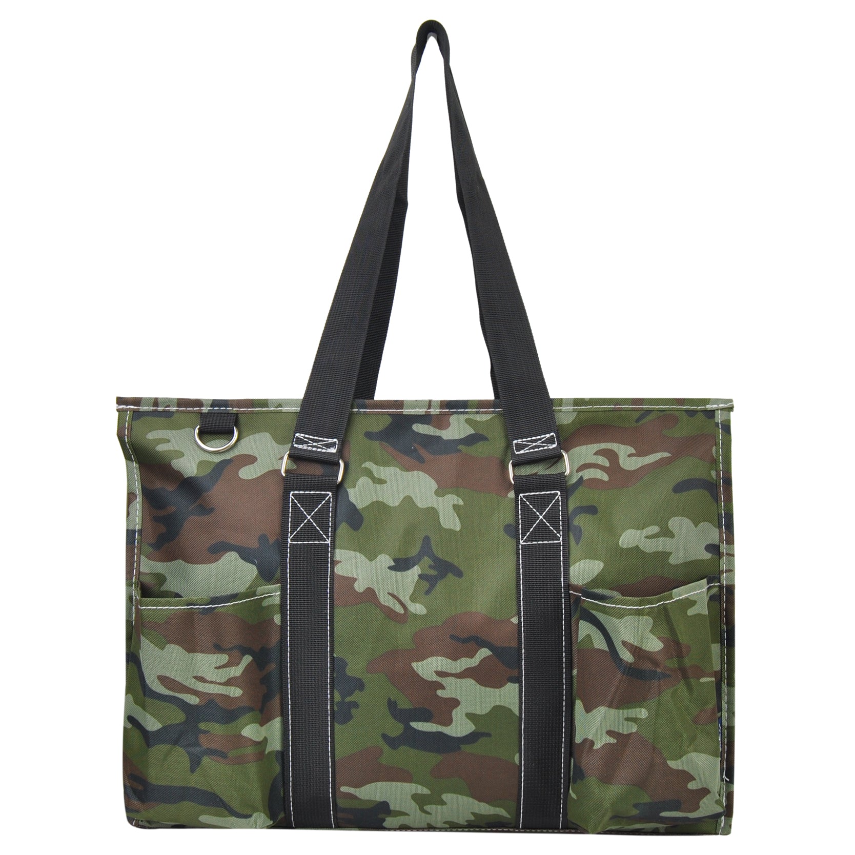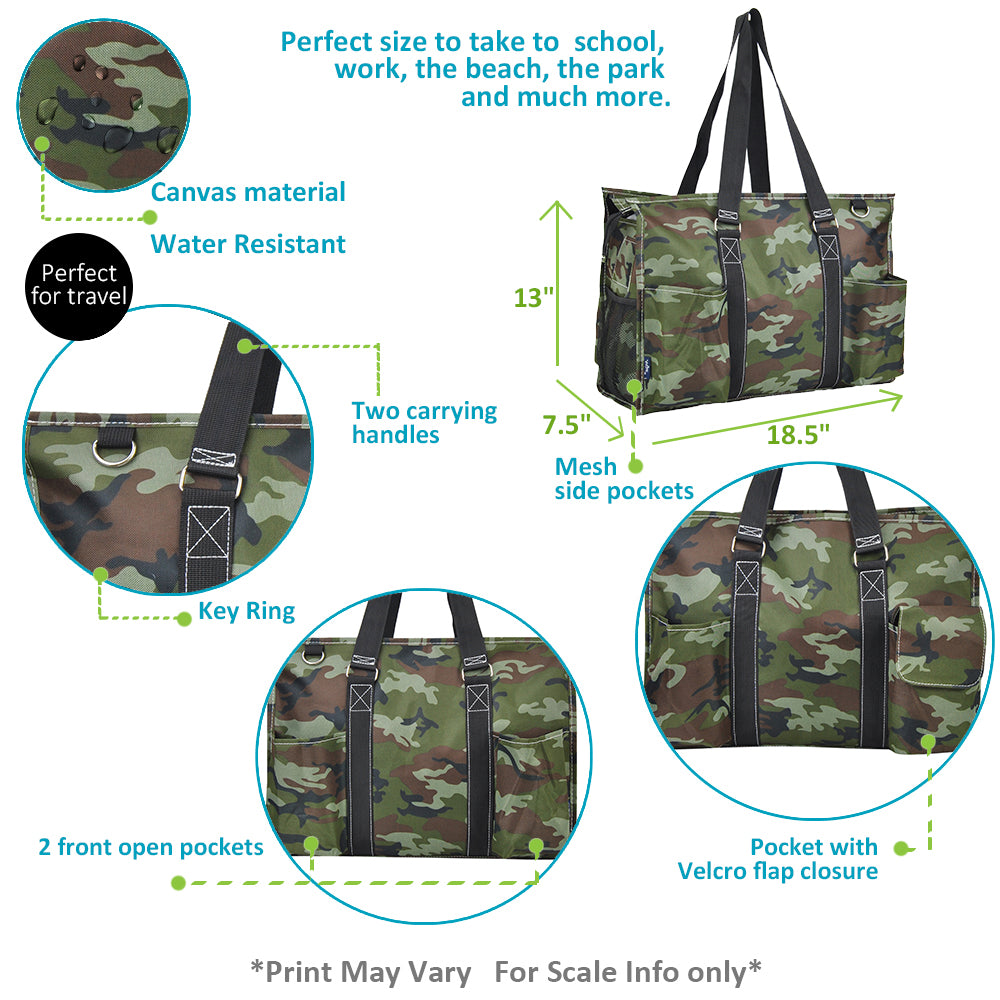 Perfect large carry-all tote bag for any occasion. The bag measures approx.:18.5"(L) X 7.5"(W) X 13"(H). Has plenty of room to be used as a diaper bag, grocery bag, overnight bag, weekender bag, beach day bag, school bag, and much more!