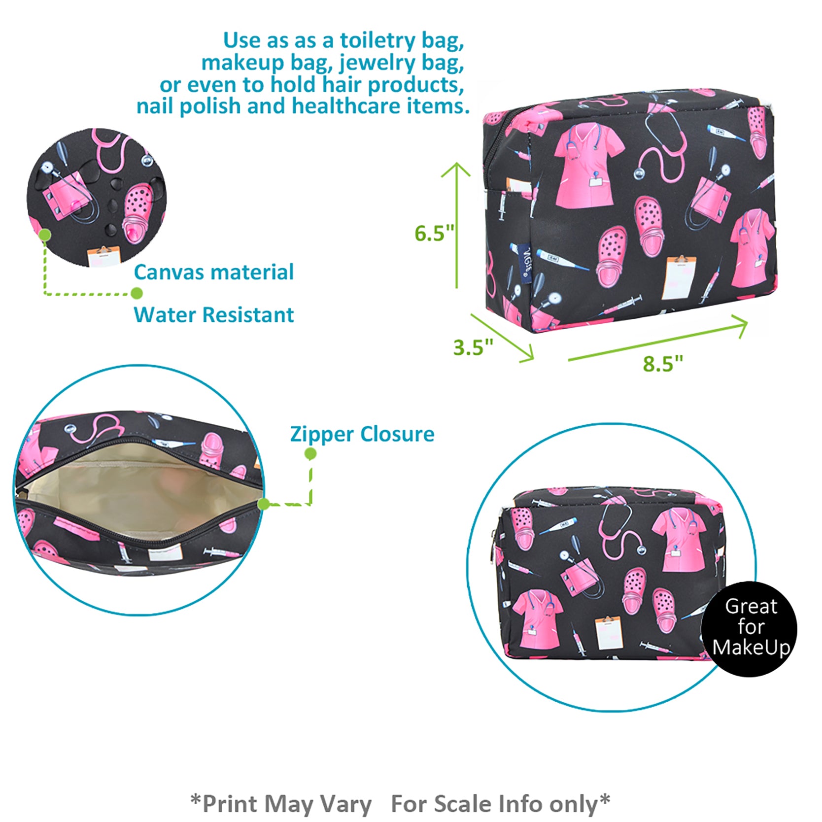 Whether you're packing essentials for your shift, clinic, or weekend getaway, this zip-top pouch holds makeup, toiletries, hair accessories, nail polish, or even first-aid items with ease. Lightweight and compact, it fits effortlessly in a work tote, carry-on, or overnight bag.