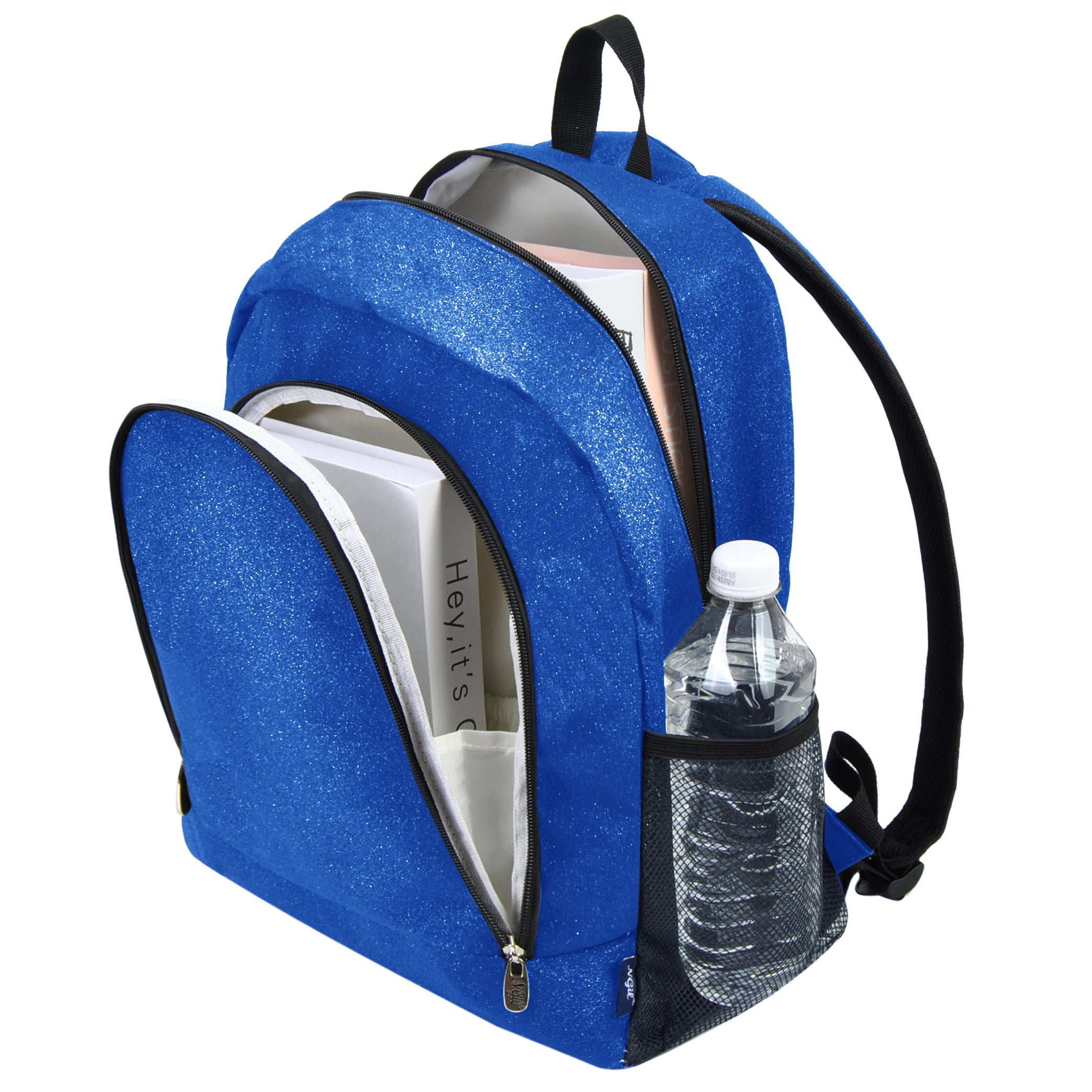 Crafted with glitter-covered fabric, it's both eye-catching and durable—ideal for travel and daily use. The main compartment is fully lined and zips closed to keep uniforms, warmups, and personal items safe. The front zip pocket is also fully lined and includes inner open and cell phone pockets for quick access to small must-haves.