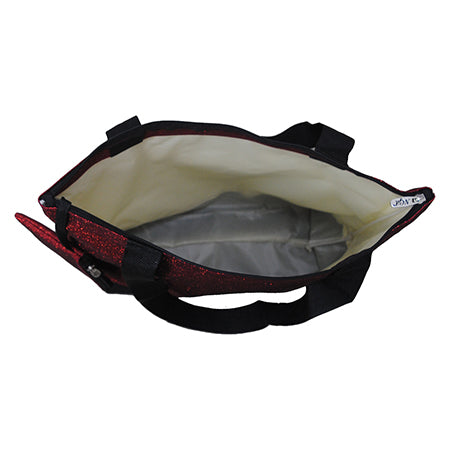 Crafted from durable glitter canvas, it features a secure top zipper closure to keep your belongings safe and a roomy interior for essentials like shoes, makeup, or notebooks. Dimensions: Approx. 13½" x 5½" x 13½" with a 9" handle drop for comfortable shoulder carrying.