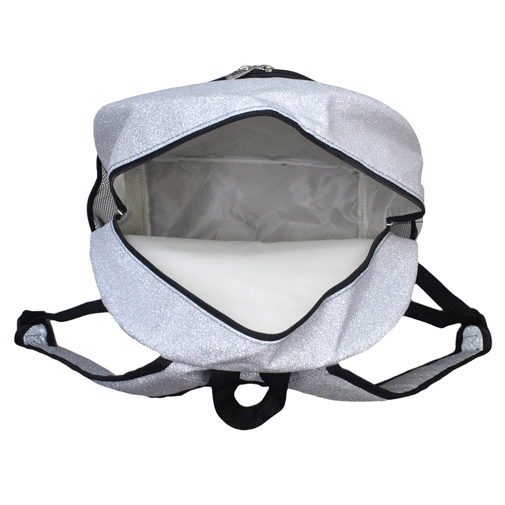 Crafted with glitter-covered fabric, it's both eye-catching and durable—ideal for travel and daily use. The main compartment is fully lined and zips closed to keep uniforms, warmups, and personal items safe. The front zip pocket is also fully lined and includes inner open and cell phone pockets for quick access to small must-haves.