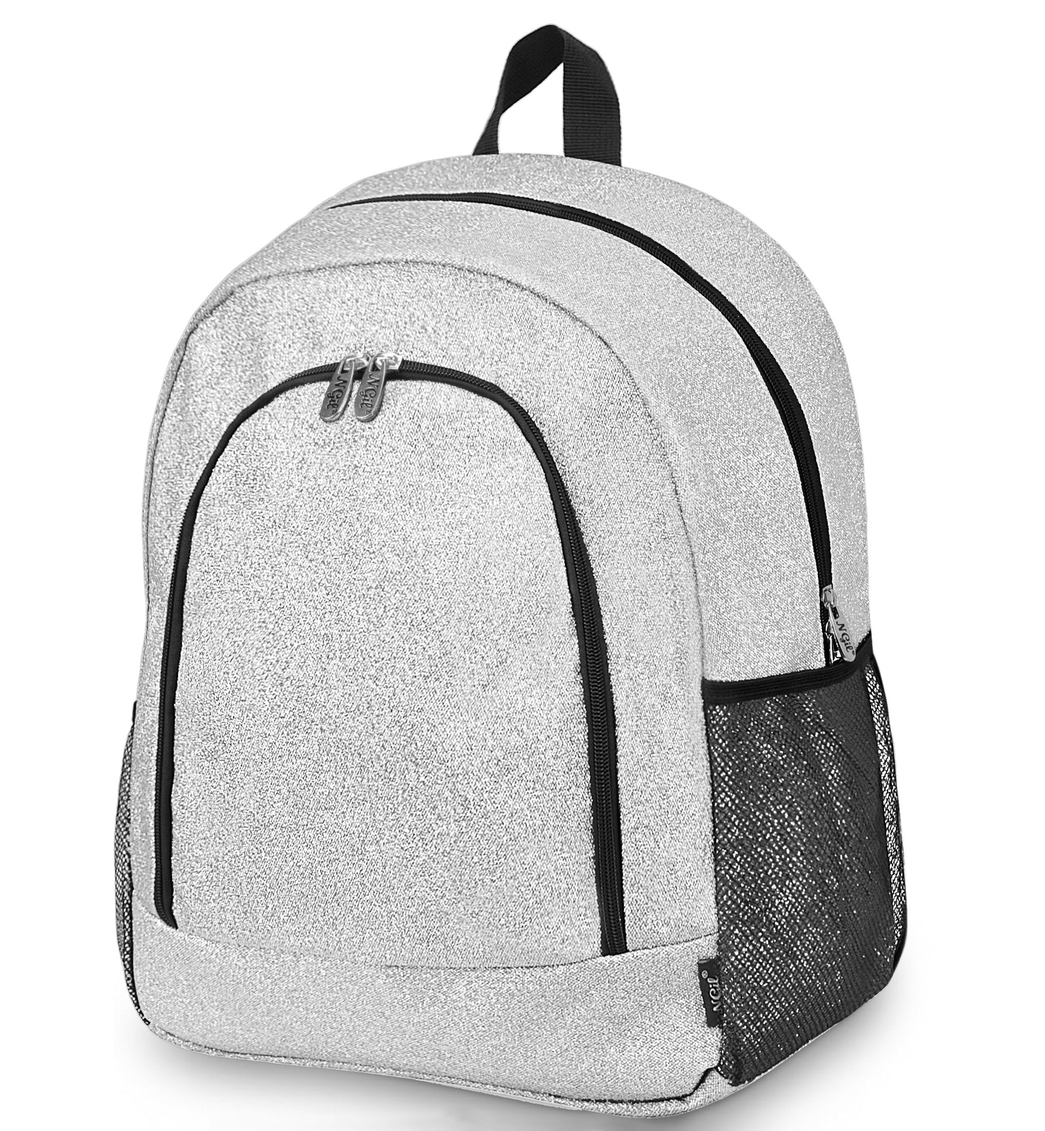 Crafted with glitter-covered fabric, it's both eye-catching and durable—ideal for travel and daily use. The main compartment is fully lined and zips closed to keep uniforms, warmups, and personal items safe. The front zip pocket is also fully lined and includes inner open and cell phone pockets for quick access to small must-haves.