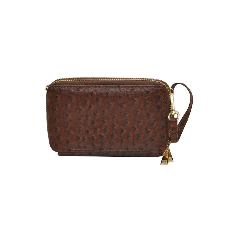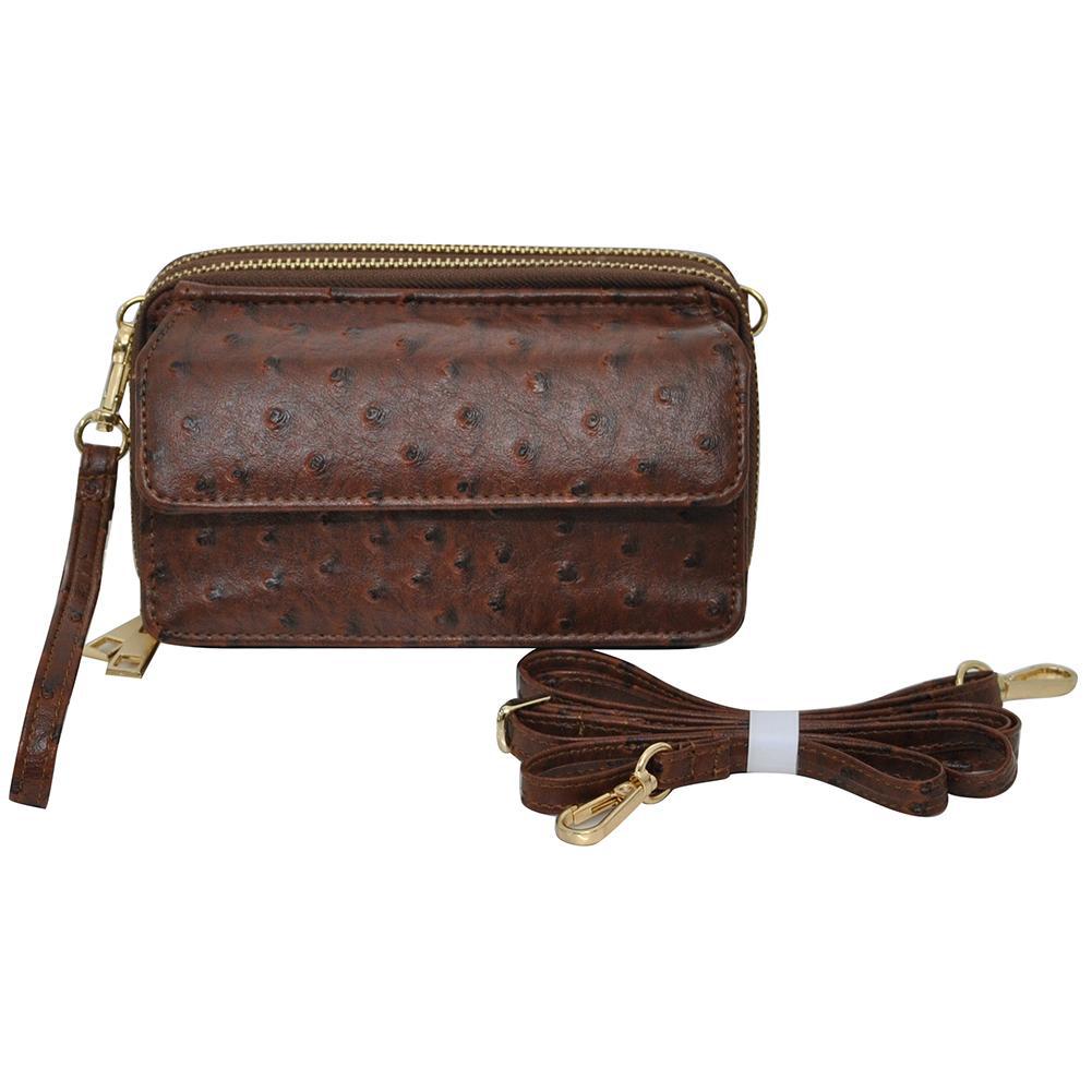 One zipper compartment features two slip pockets with an additional side pocket & zipper coin pocket. Other zippered compartment includes a large bill pocket, 8 card slips, 1 ID window and 4 open pockets. 55" removable and adjustable strap; Removable wrist strap approx. 5.25" handle drop