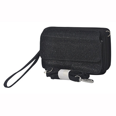 Crafted from durable canvas with a fun glitter finish, this all-in-one wallet measures approximately 6.5" (L) x 2.25" (W) x 4.25" (H), offering just the right amount of space without the bulk. The front magnetic pocket (approx. 6.5" x 3.5") is perfect for holding most modern smartphones like the iPhone 13/14, iPhone SE, or Samsung Galaxy S23—giving you quick access on the go.