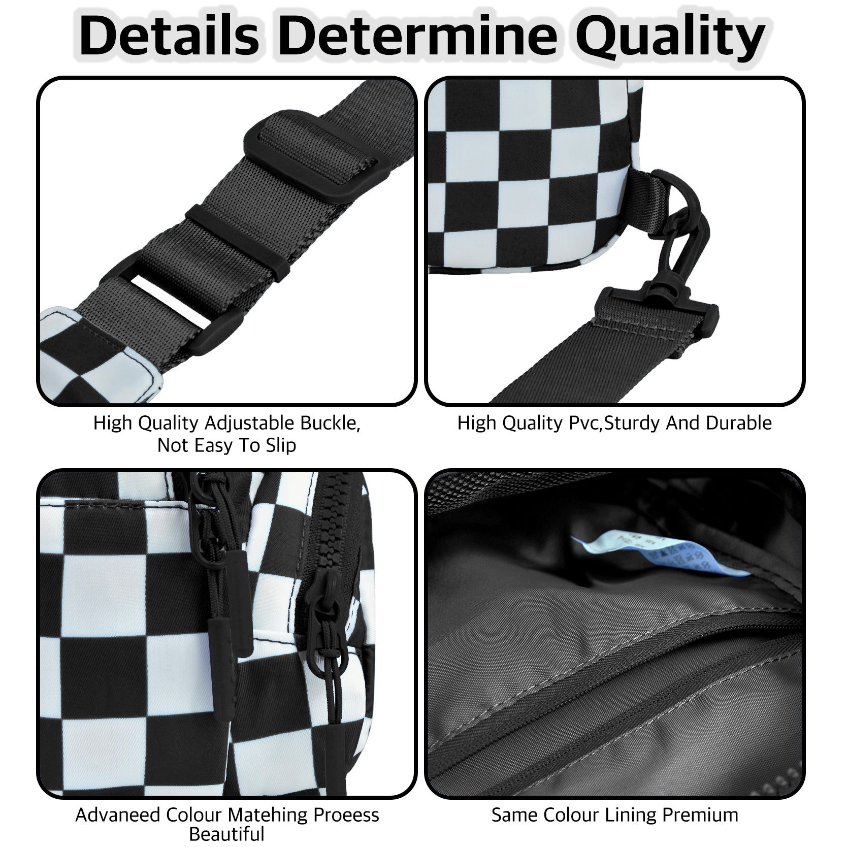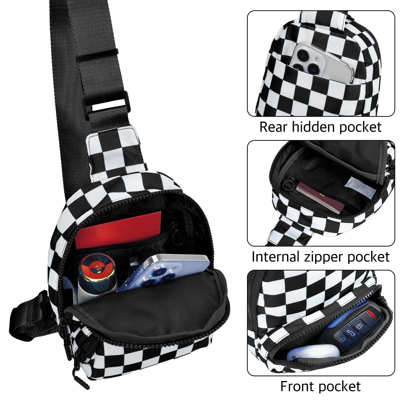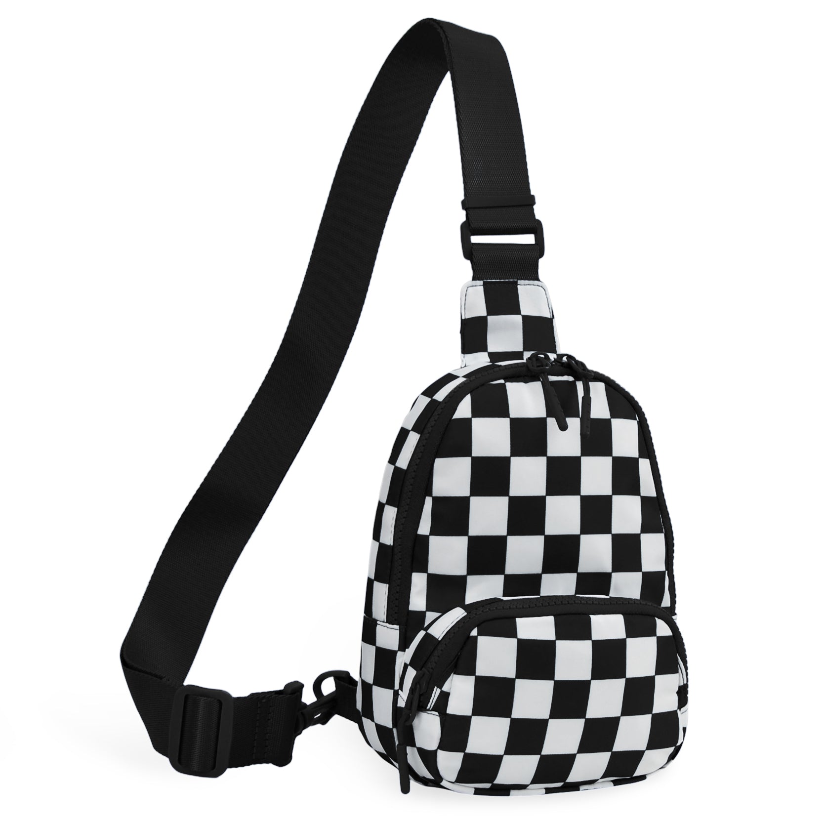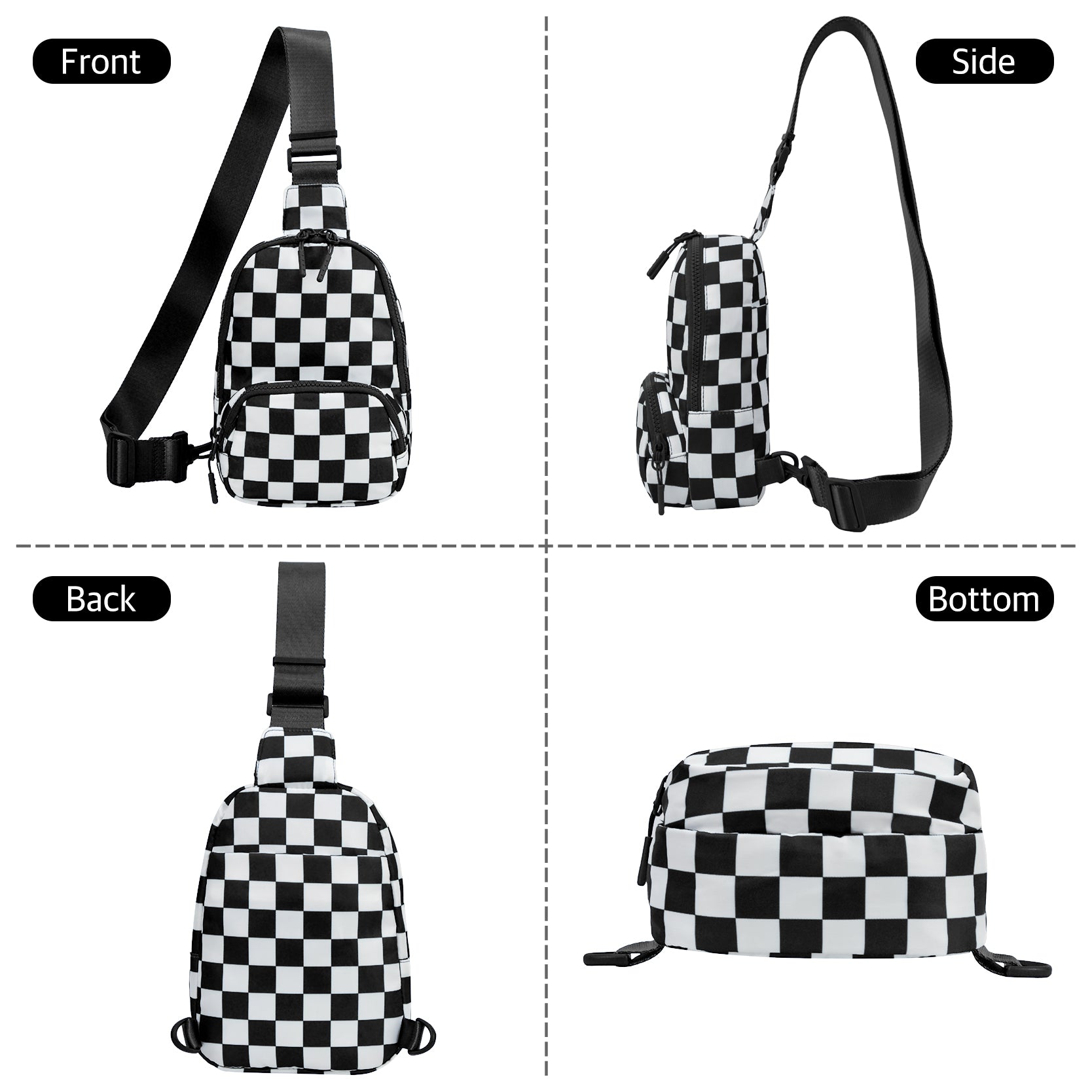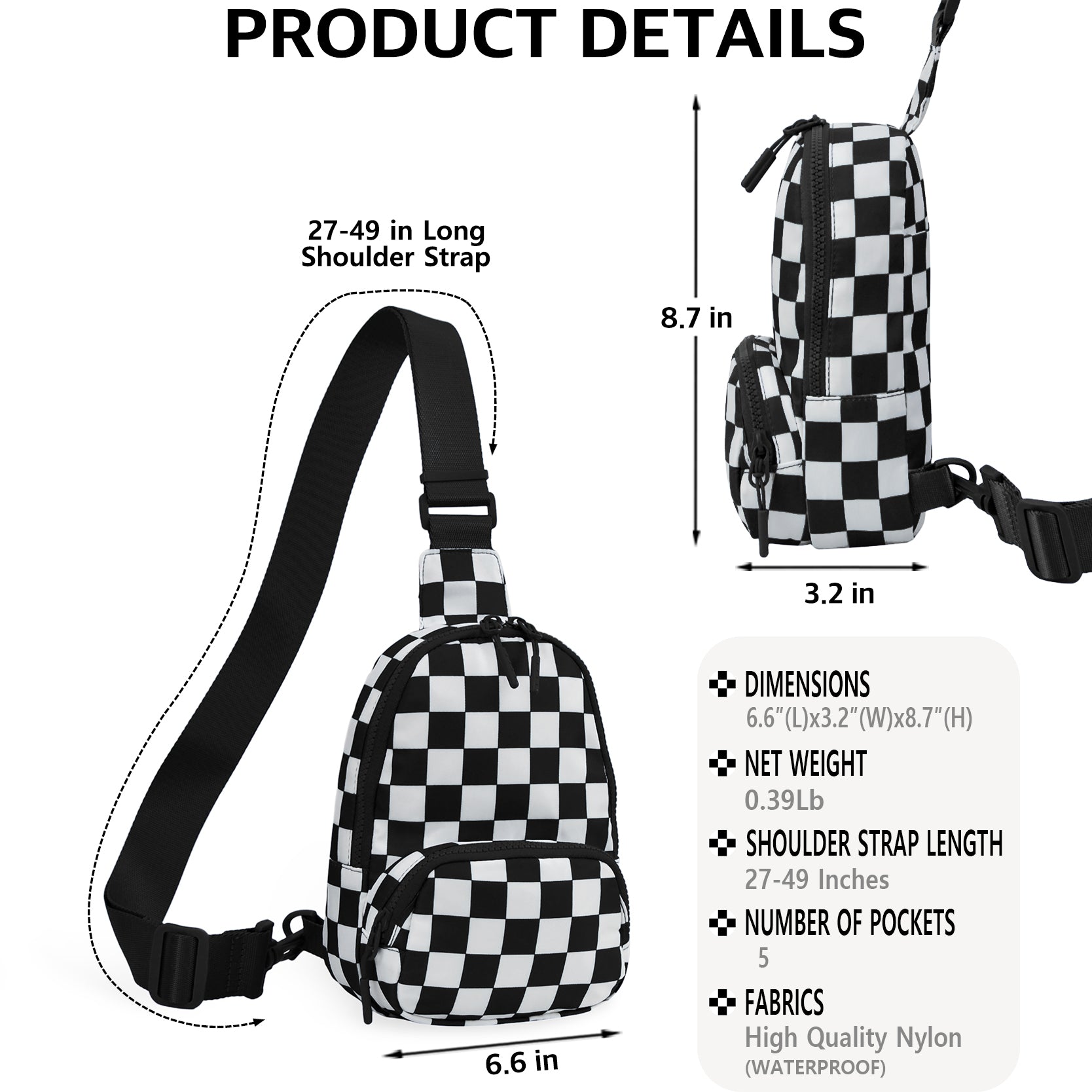 Designed for everyday convenience with a bold, modern edge, the Small Checkered Sling Fanny Pack is the perfect grab-and-go accessory for busy days and on-the-move lifestyles. Made from durable nylon material, this lightweight bag is easy to maintain and ideal for travel, concerts, festivals, errands, and casual outings. Measuring approximately 6.6"(L) x 3.2"(W) x 8.7"(H), it offers smart organization with five pockets, including a front zipper pocket for quick-access items, a roomy top main zipper compartment, two side pockets, and a hidden back pocket for added security. Inside, an interior slip pocket keeps smaller essentials neatly in place. The adjustable 27–49" shoulder strap allows for versatile wear as a sling, crossbody, or waist pack, providing hands-free comfort throughout the day. Finished with a classic black-and-white checkered design, this compact fanny pack combines style and function for effortless everyday use.