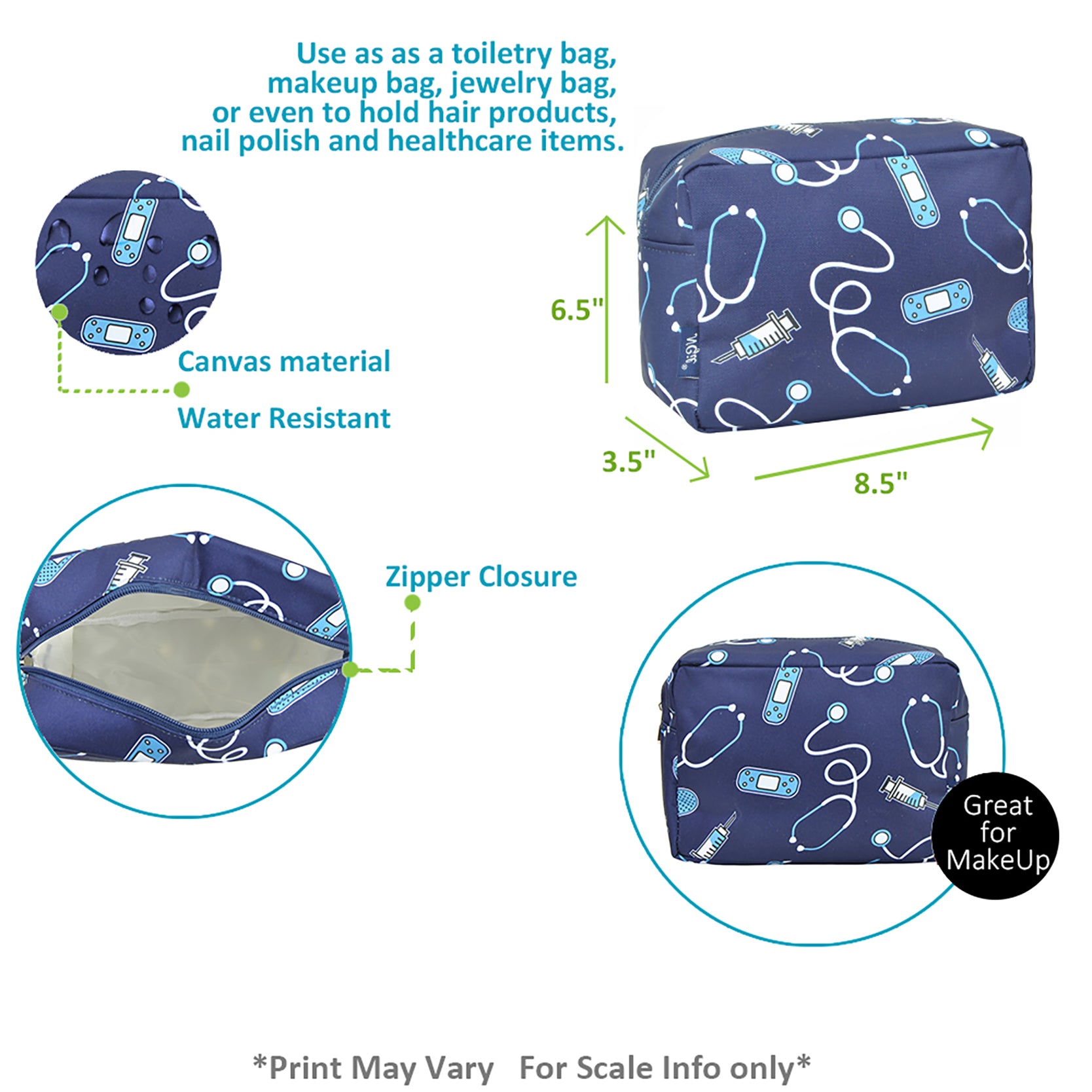 Whether you're packing essentials for your shift, clinic, or weekend getaway, this zip-top pouch holds makeup, toiletries, hair accessories, nail polish, or even first-aid items with ease. Lightweight and compact, it fits effortlessly in a work tote, carry-on, or overnight bag.