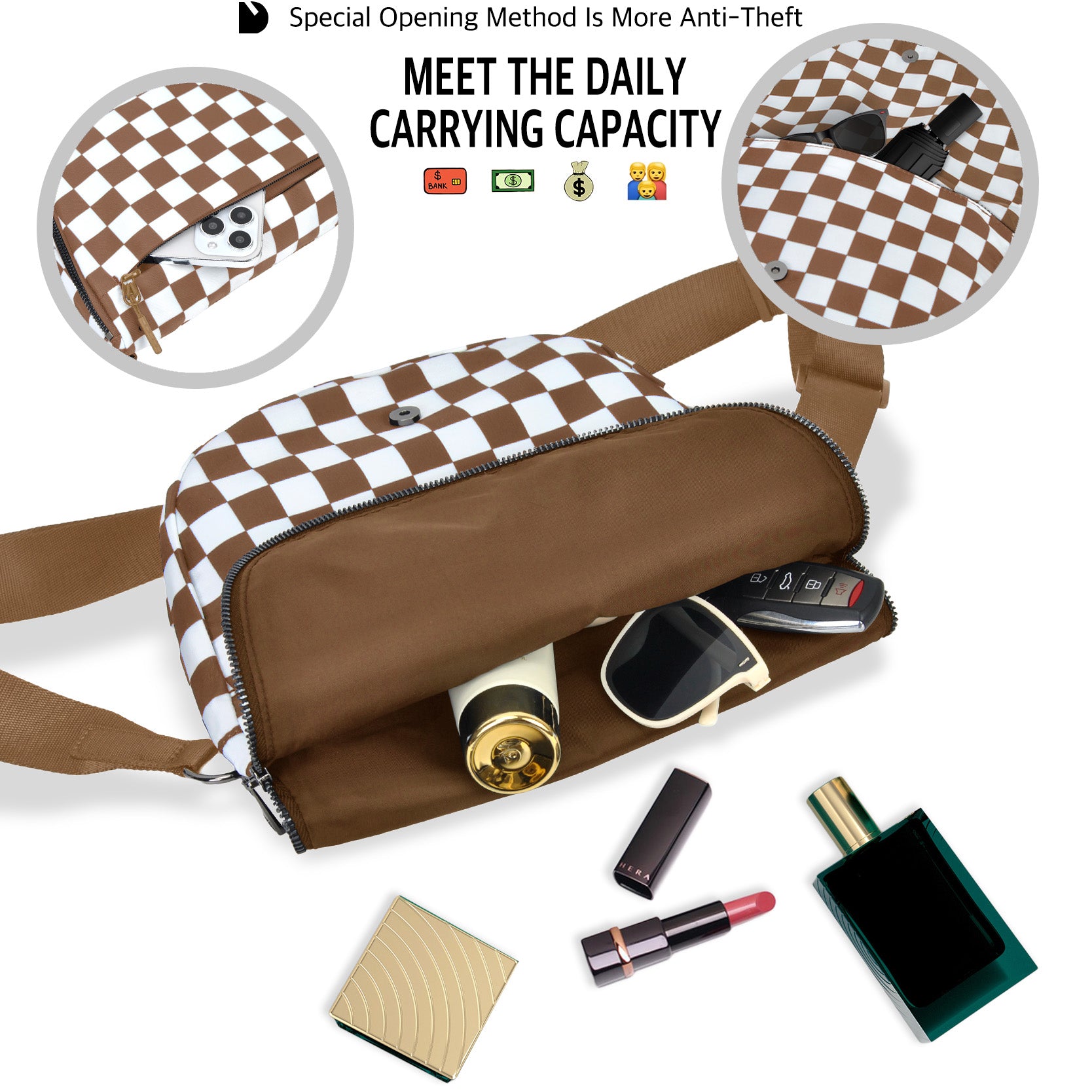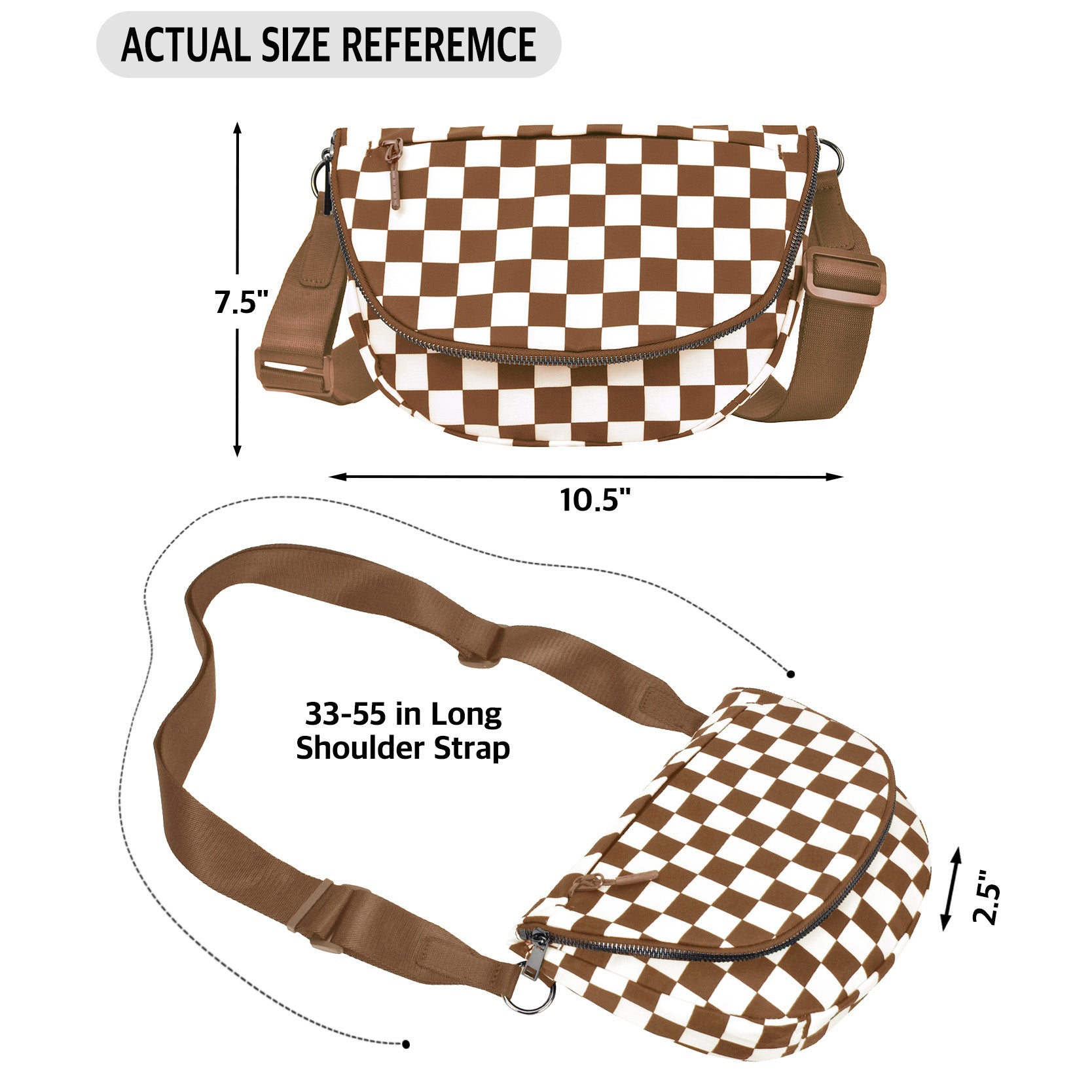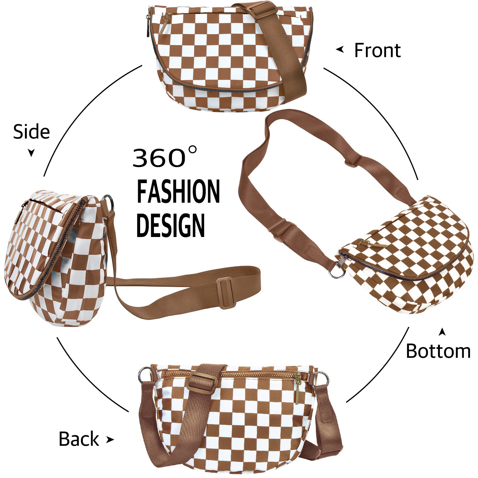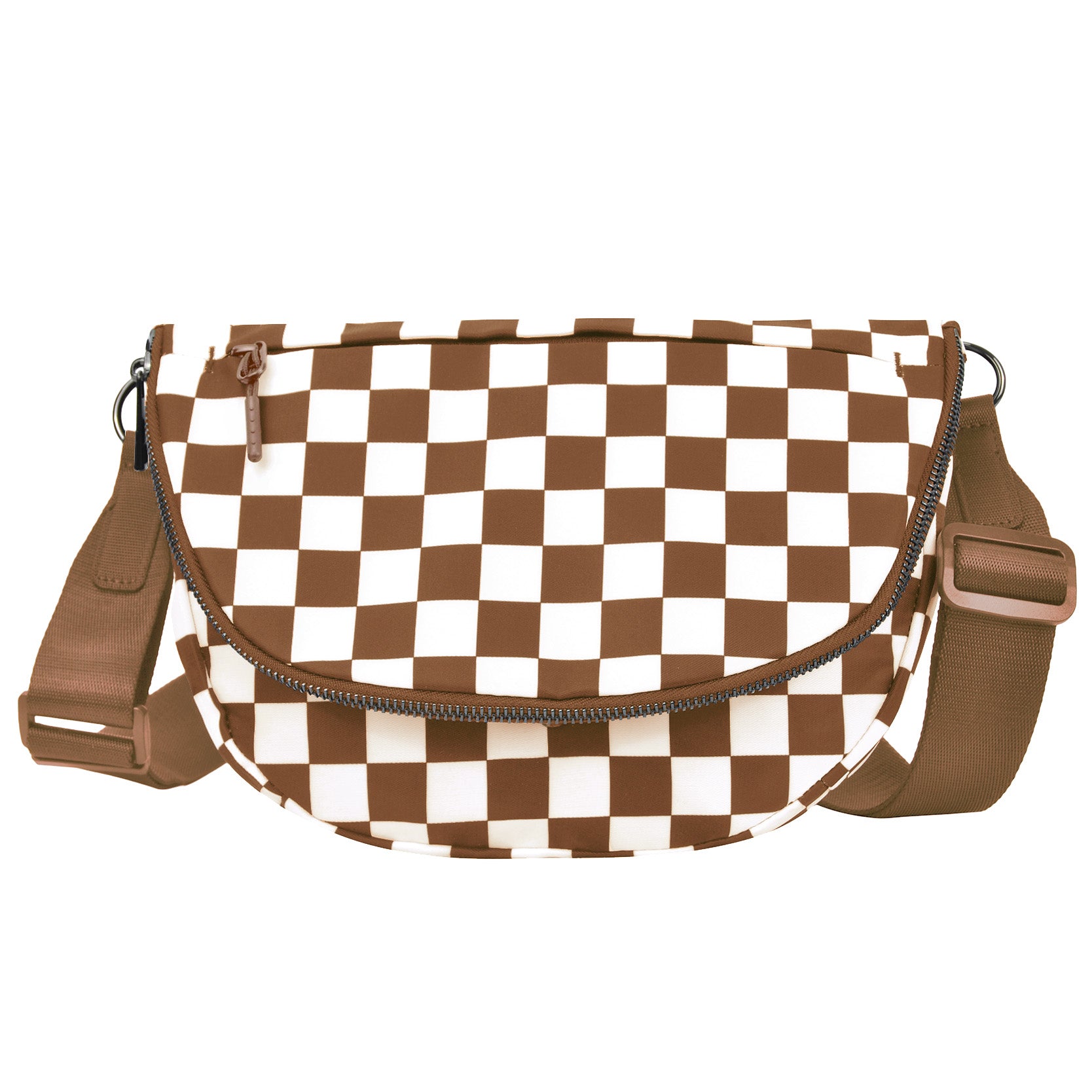Coffee Checkered Crescent Hobo Crossbody Bag
