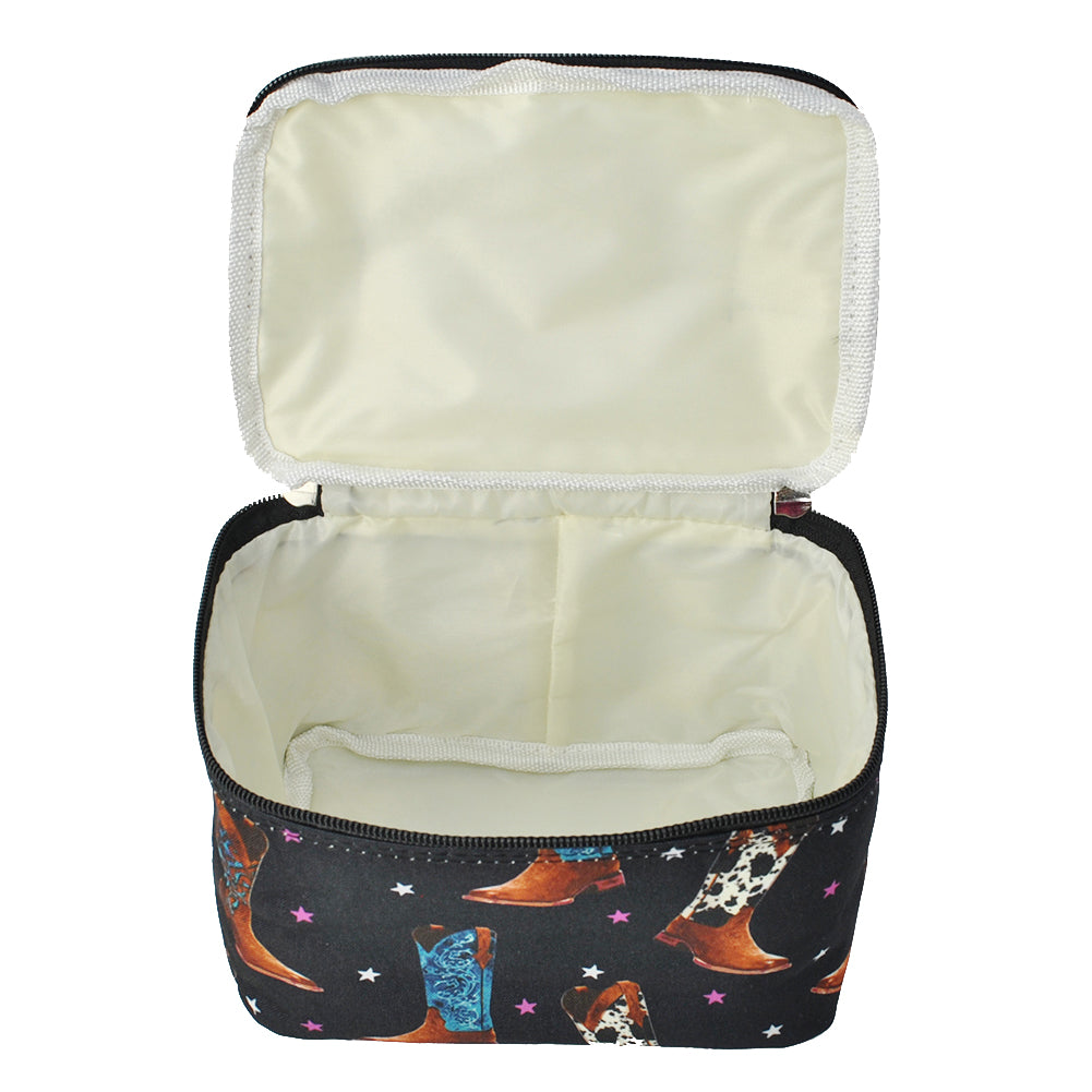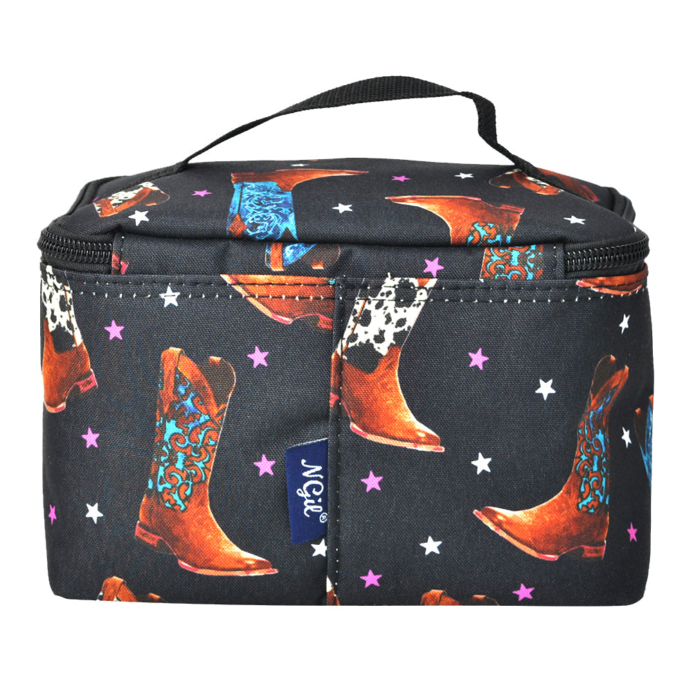 This cosmetic case is perfect to go cosmetic case. It has a single handle and a top zipper closure. It makes it easy to travel and carry all cosmetics in one bag. It is big enough to hold foundation makeup, lipsticks, and makeup brushes.