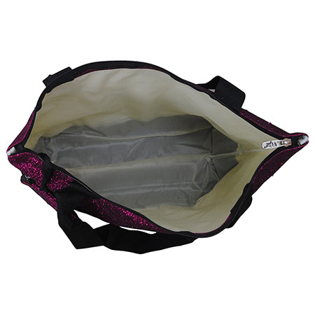 Crafted from durable glitter canvas, it features a secure top zipper closure to keep your belongings safe and a roomy interior for essentials like shoes, makeup, or notebooks. Dimensions: Approx. 13½" x 5½" x 13½" with a 9" handle drop for comfortable shoulder carrying.