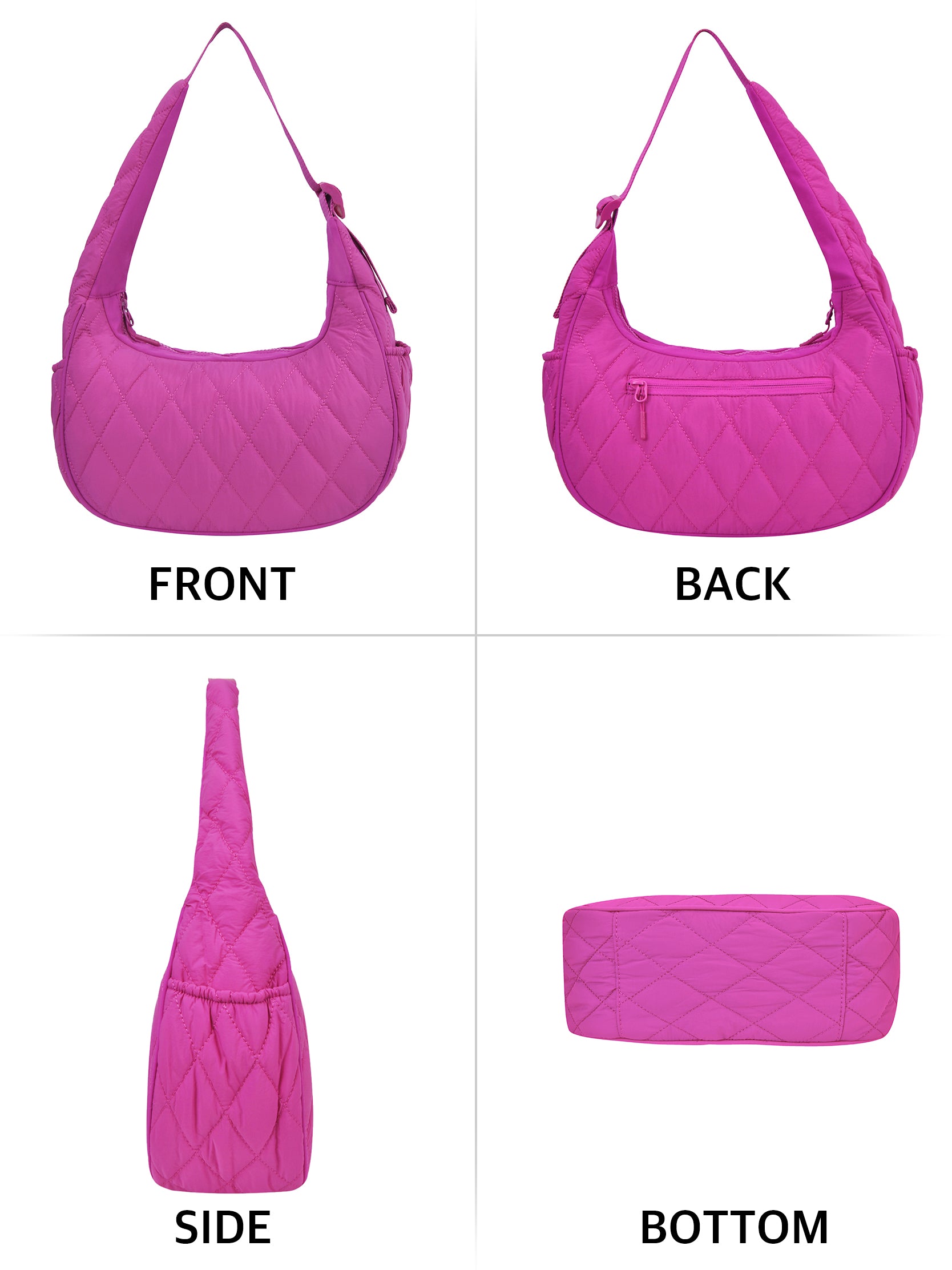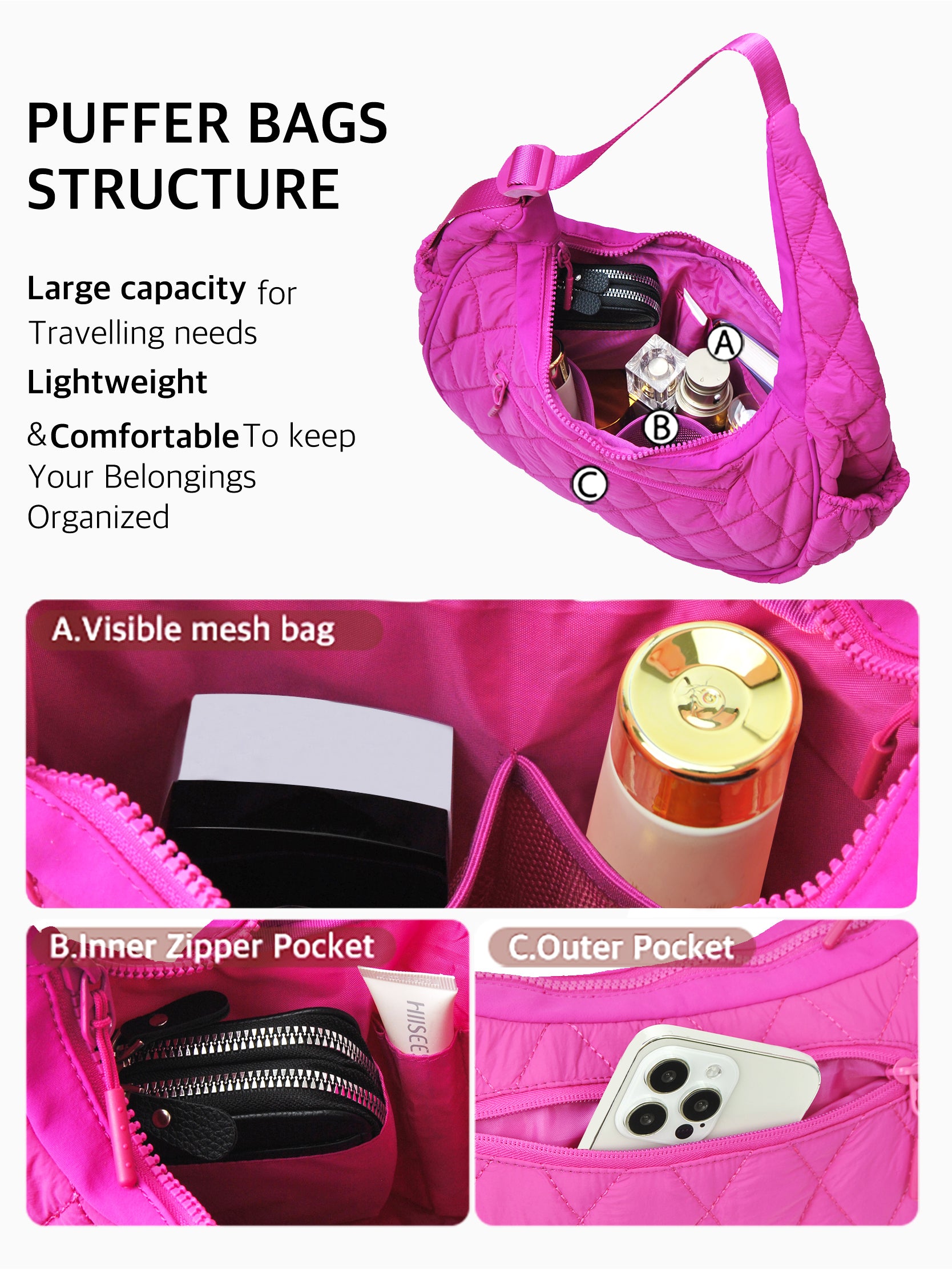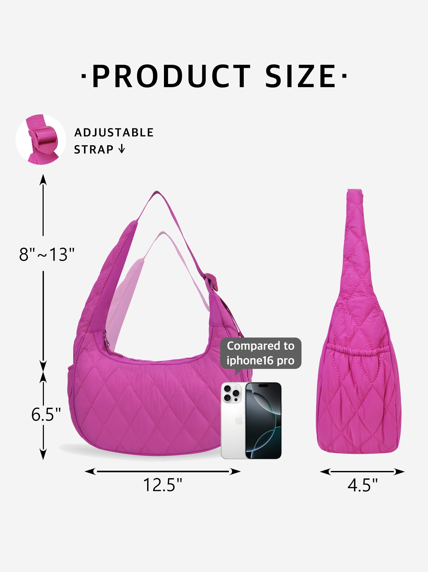 Elevate your everyday style with the Quilted Puffer Shoulder Bag, a chic yet practical accessory designed for modern lifestyles. Crafted from durable quilted nylon with a soft puffer aesthetic, this lightweight bag combines fashion and function in one versatile silhouette. Measuring 12.5" (L) x 4.5" (W) x 6.5" (H), it offers just the right amount of space without weighing you down.