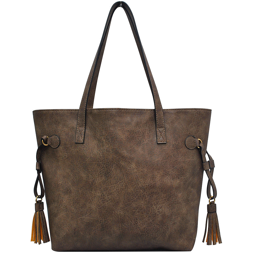 Designed with two chic tassels on each side for added flair, this tote features an open-top design for quick access to your belongings, while an inside zipper money pocket keeps smaller essentials secure and organized. Sleek, functional, and versatile, this bag is a stylish option for anyone in need of a reliable tote that works for both casual and everyday occasions.