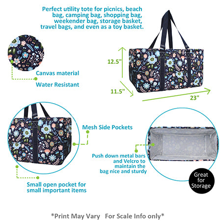 The NGIL Utility Tote Bag is your ultimate carry-all—cute, practical, and ready for any occasion. Crafted from durable, water-resistant canvas, this large tote is built to handle busy days and outdoor adventures alike. Measuring approximately 23"L x 11.5"D x 12.5"H, it’s spacious enough for beach trips, picnics, camping, shopping, or even organizing toys and supplies. The collapsible design with push-down metal bars and Velcro sides keeps it sturdy when in use and easy to store when not. An open top allows quick access to towels, groceries, or essentials, while a mesh pocket and small open pocket keep smaller items handy. Finished with double handles that drop about 13" for comfortable carrying, this tote combines functionality with effortless style. It’s a thoughtful and versatile gift for friends, teachers, and family alike.