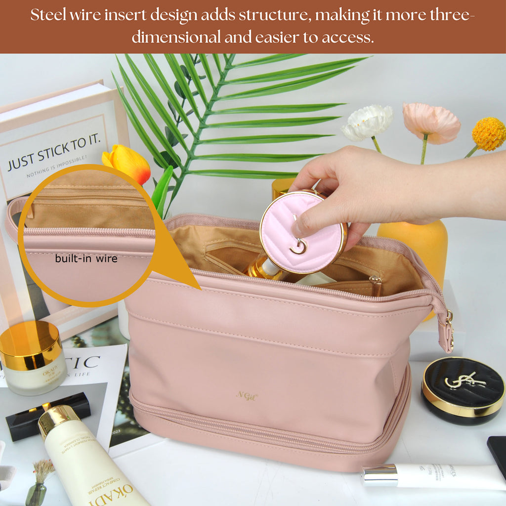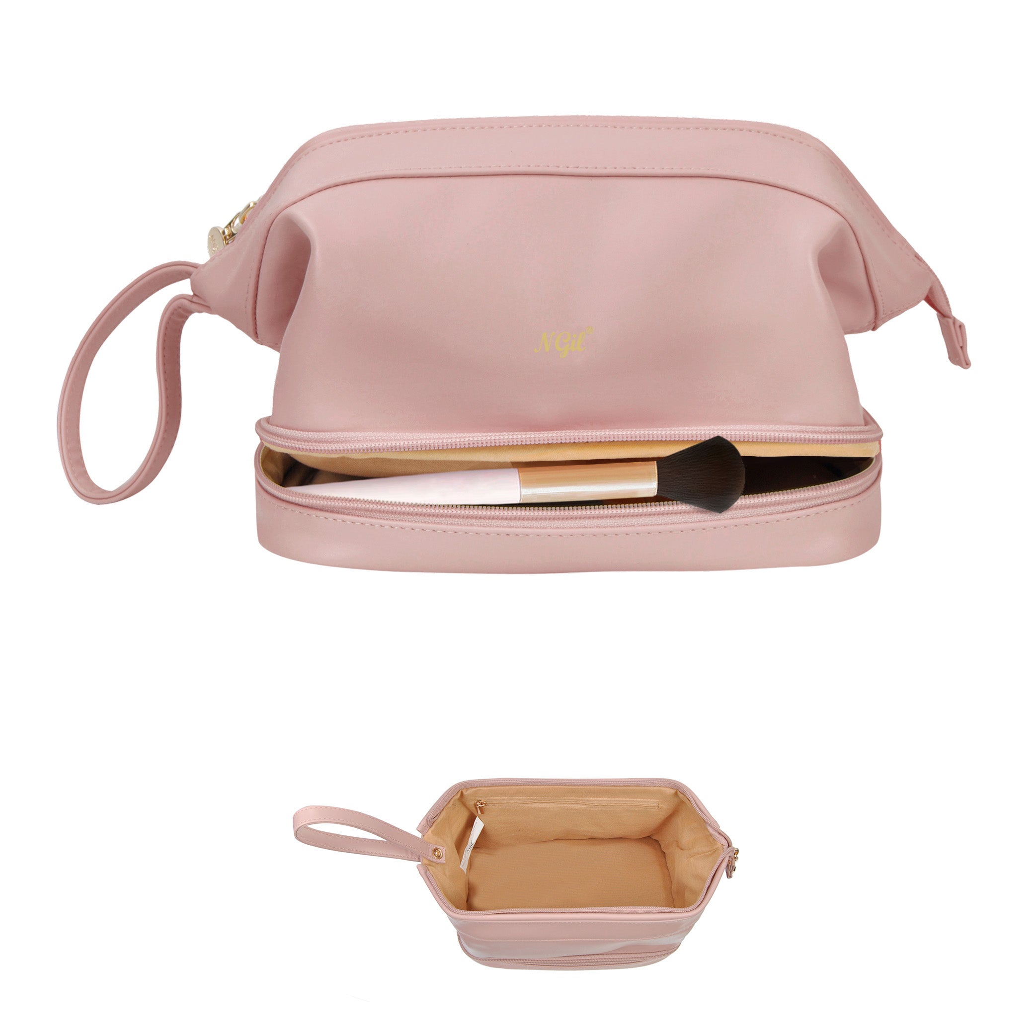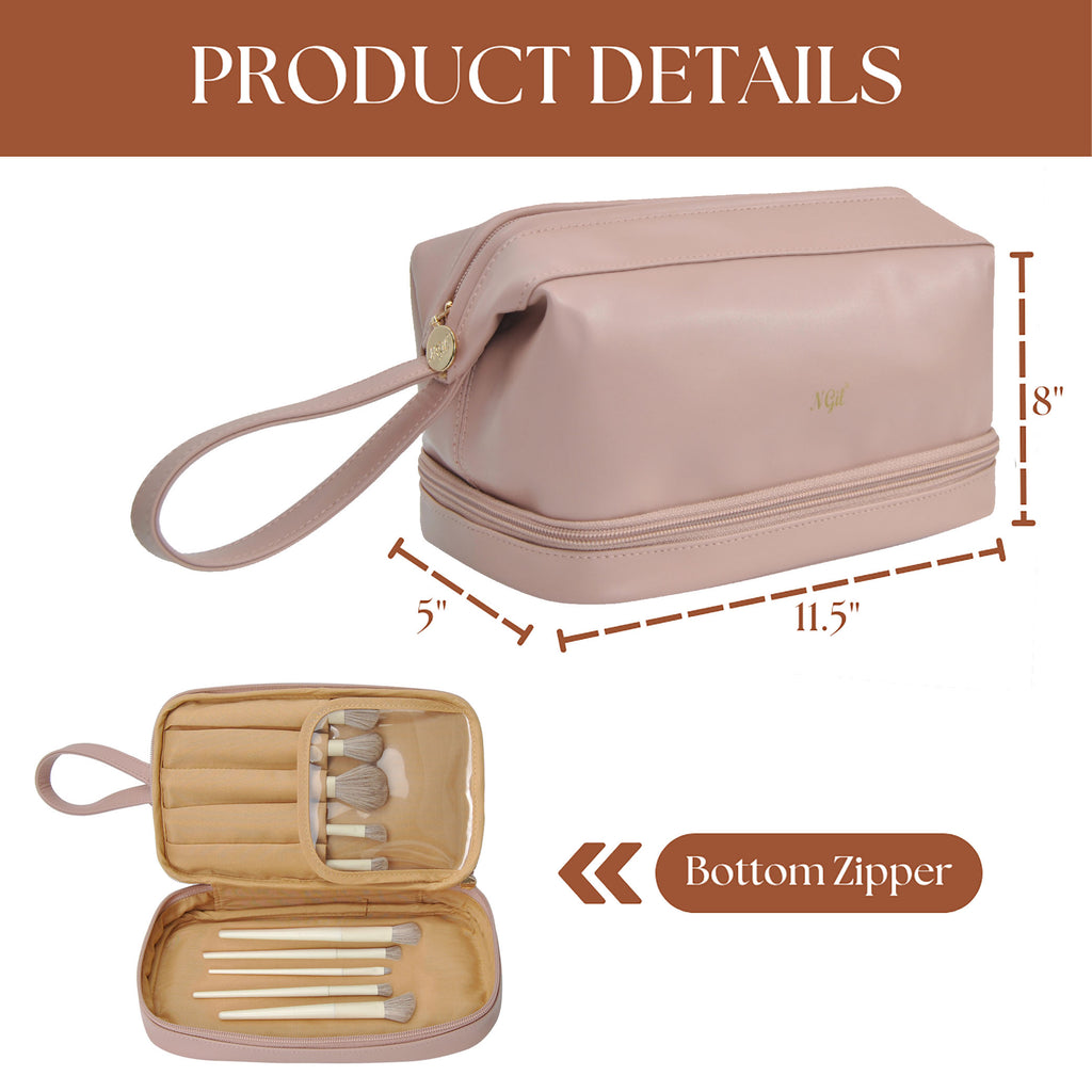 Upgrade your beauty game with the NGIL Faux Leather Cosmetic Bag! Measuring 11.5" x 5" x 8", this chic bag is made from luxurious faux leather with eye-catching gold metal accents. It features two zippered compartments, offering ample space for all your makeup essentials. The main compartment includes a built-in wire frame, making it easy to keep it wide open for quick access. An extra side zippered pocket and open slot ensure effortless organization, while the bottom compartment is designed for your brushes, featuring five slots and a clear flap for easy styling!