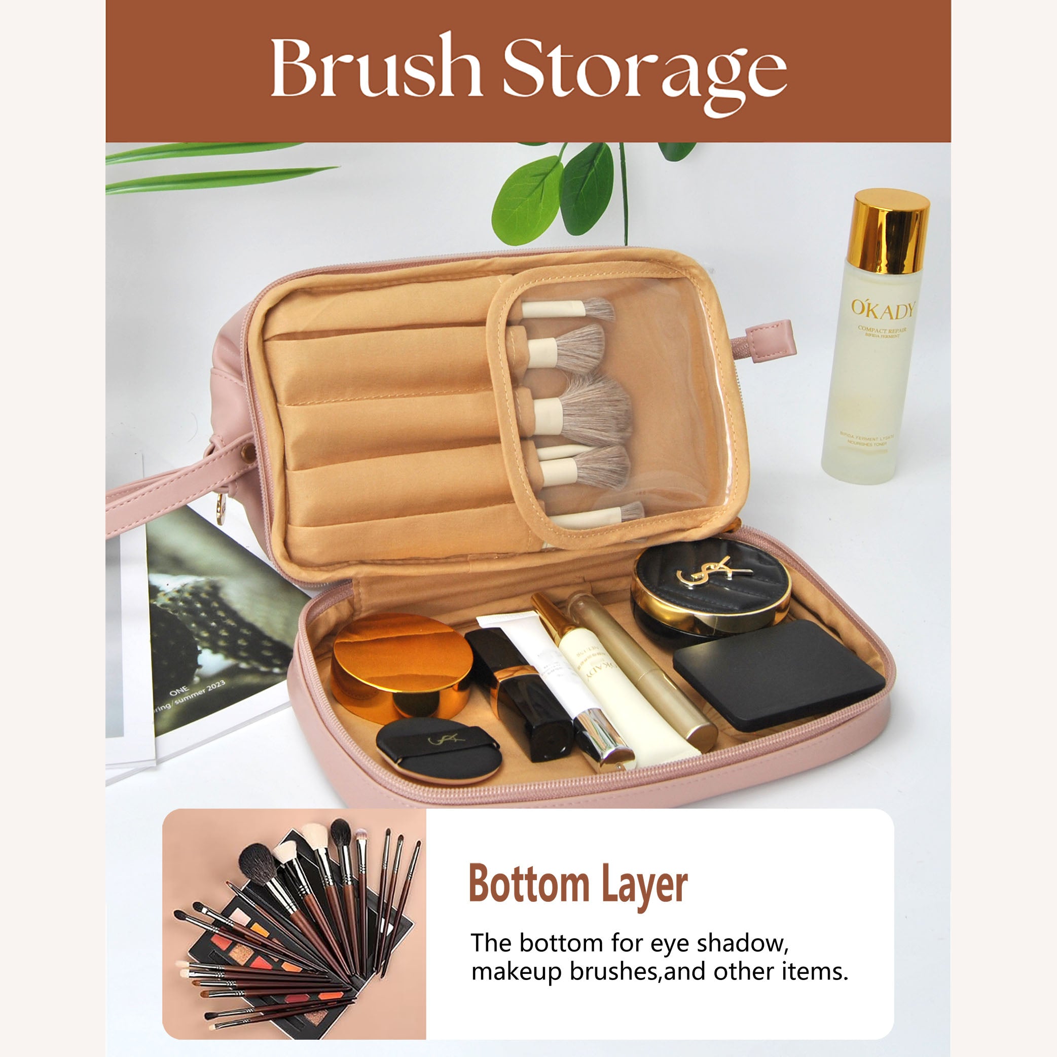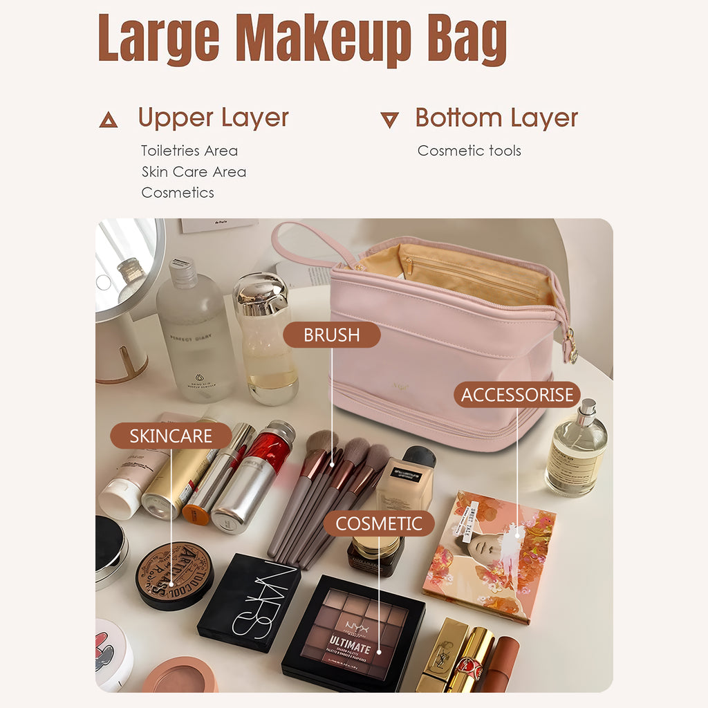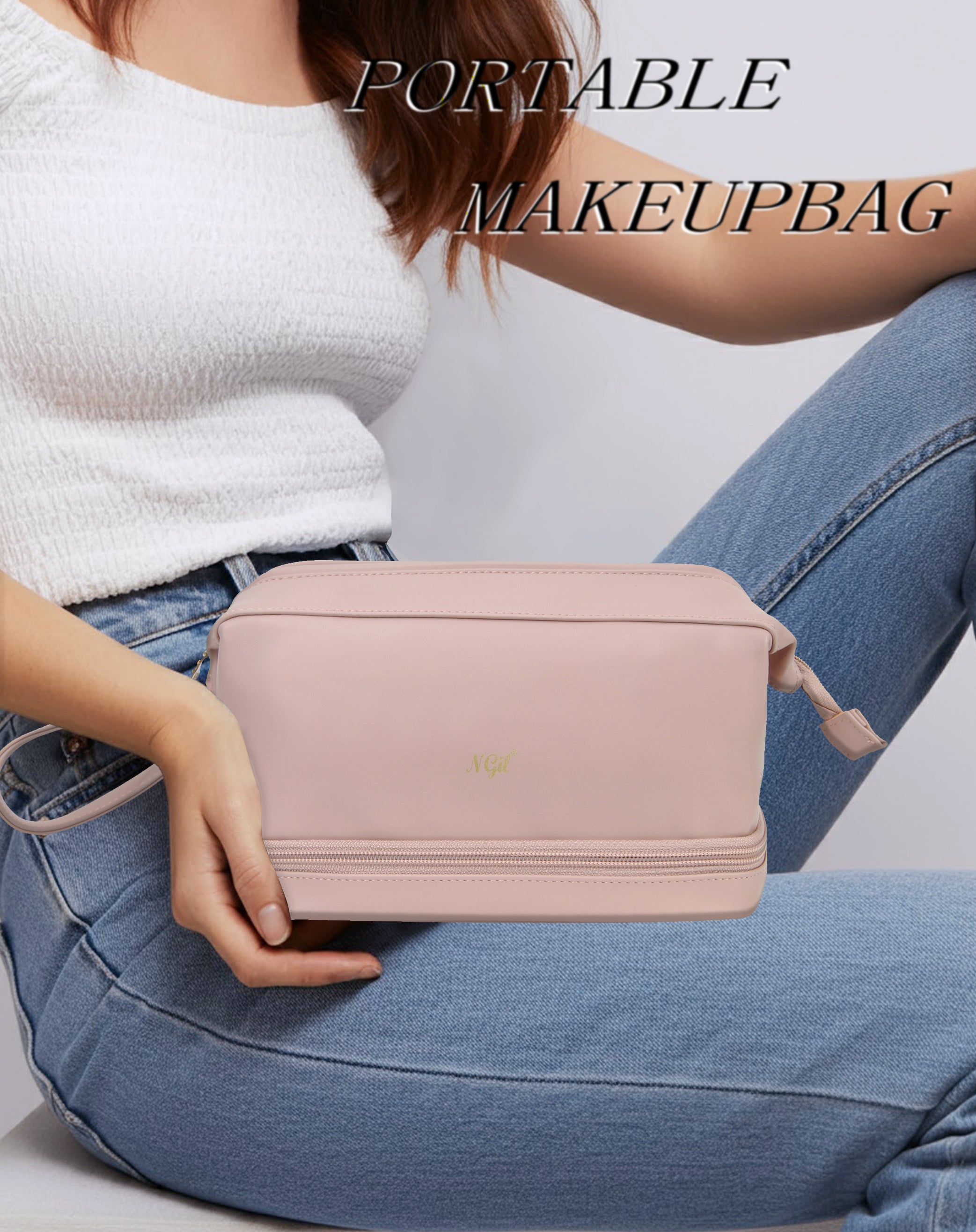 Upgrade your beauty game with the NGIL Faux Leather Cosmetic Bag! Measuring 11.5" x 5" x 8", this chic bag is made from luxurious faux leather with eye-catching gold metal accents. It features two zippered compartments, offering ample space for all your makeup essentials. The main compartment includes a built-in wire frame, making it easy to keep it wide open for quick access. An extra side zippered pocket and open slot ensure effortless organization, while the bottom compartment is designed for your brushes, featuring five slots and a clear flap for easy styling!