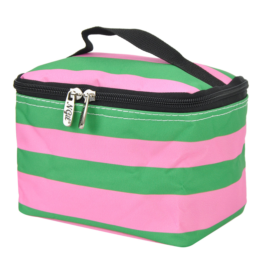 This cosmetic case is perfect to go cosmetic case. It has a single handle and a top zipper closure. It makes it easy to travel and carry all cosmetics in one bag. It is big enough to hold foundation makeup, lipsticks, and makeup brushes.