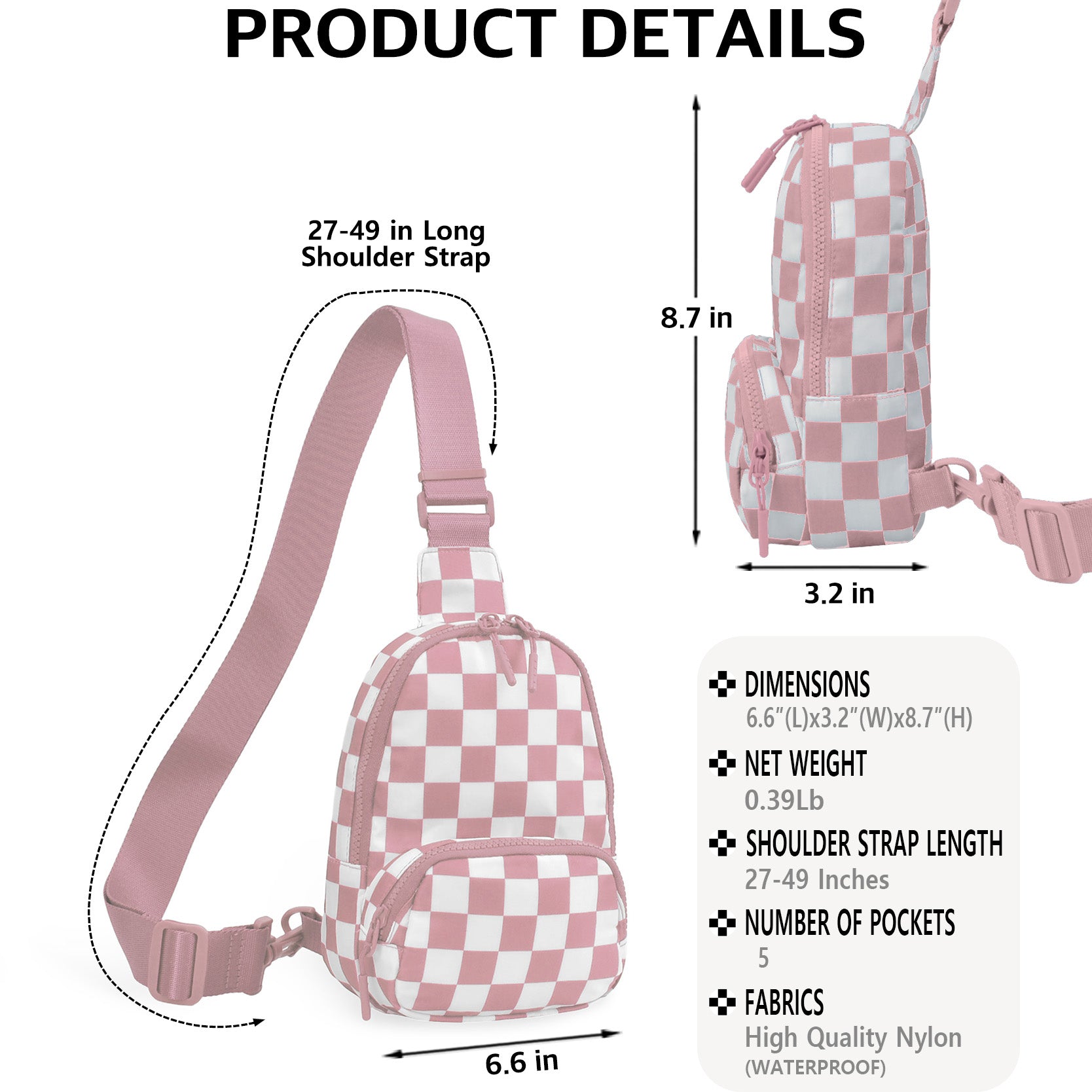Designed for everyday convenience with a bold, modern edge, the Small Checkered Sling Fanny Pack is the perfect grab-and-go accessory for busy days and on-the-move lifestyles. Made from durable nylon material, this lightweight bag is easy to maintain and ideal for travel, concerts, festivals, errands, and casual outings. Measuring approximately 6.6"(L) x 3.2"(W) x 8.7"(H), it offers smart organization with five pockets, including a front zipper pocket for quick-access items, a roomy top main zipper compartment, two side pockets, and a hidden back pocket for added security. Inside, an interior slip pocket keeps smaller essentials neatly in place. The adjustable 27–49" shoulder strap allows for versatile wear as a sling, crossbody, or waist pack, providing hands-free comfort throughout the day. Finished with a classic black-and-white checkered design, this compact fanny pack combines style and function for effortless everyday use.