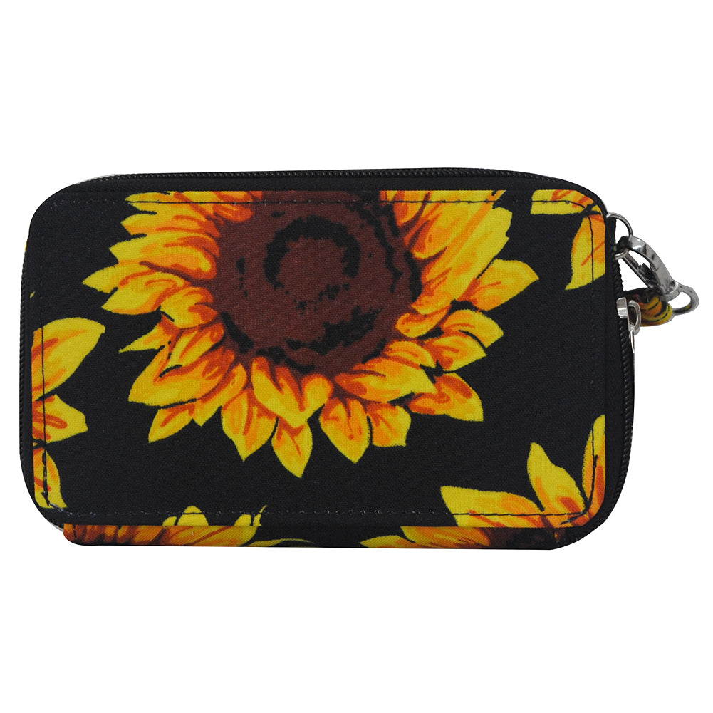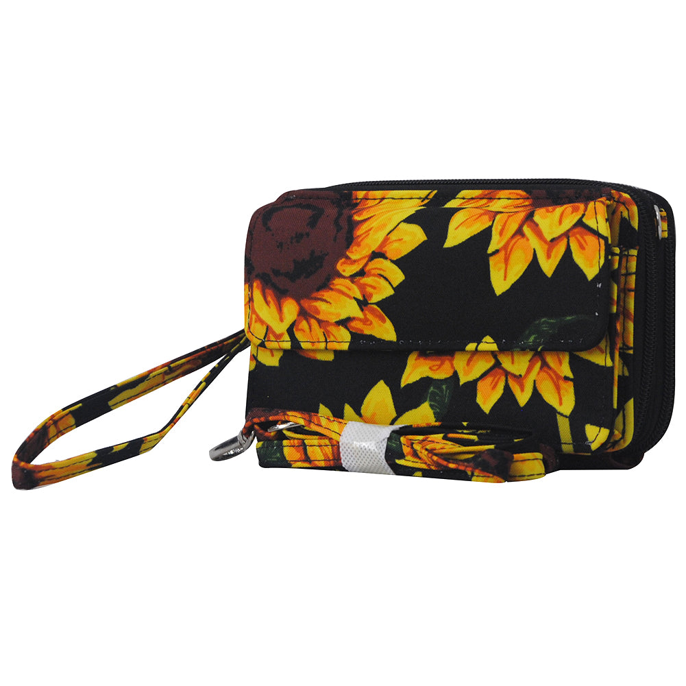 One zipper compartment features two slip pockets with an additional side pocket & zipper coin pocket. Other zippered compartment includes a large bill pocket, 8 card slips, 1 ID window and 4 open pockets. 55" removable and adjustable strap; Removable wrist strap approx. 5.25" handle drop